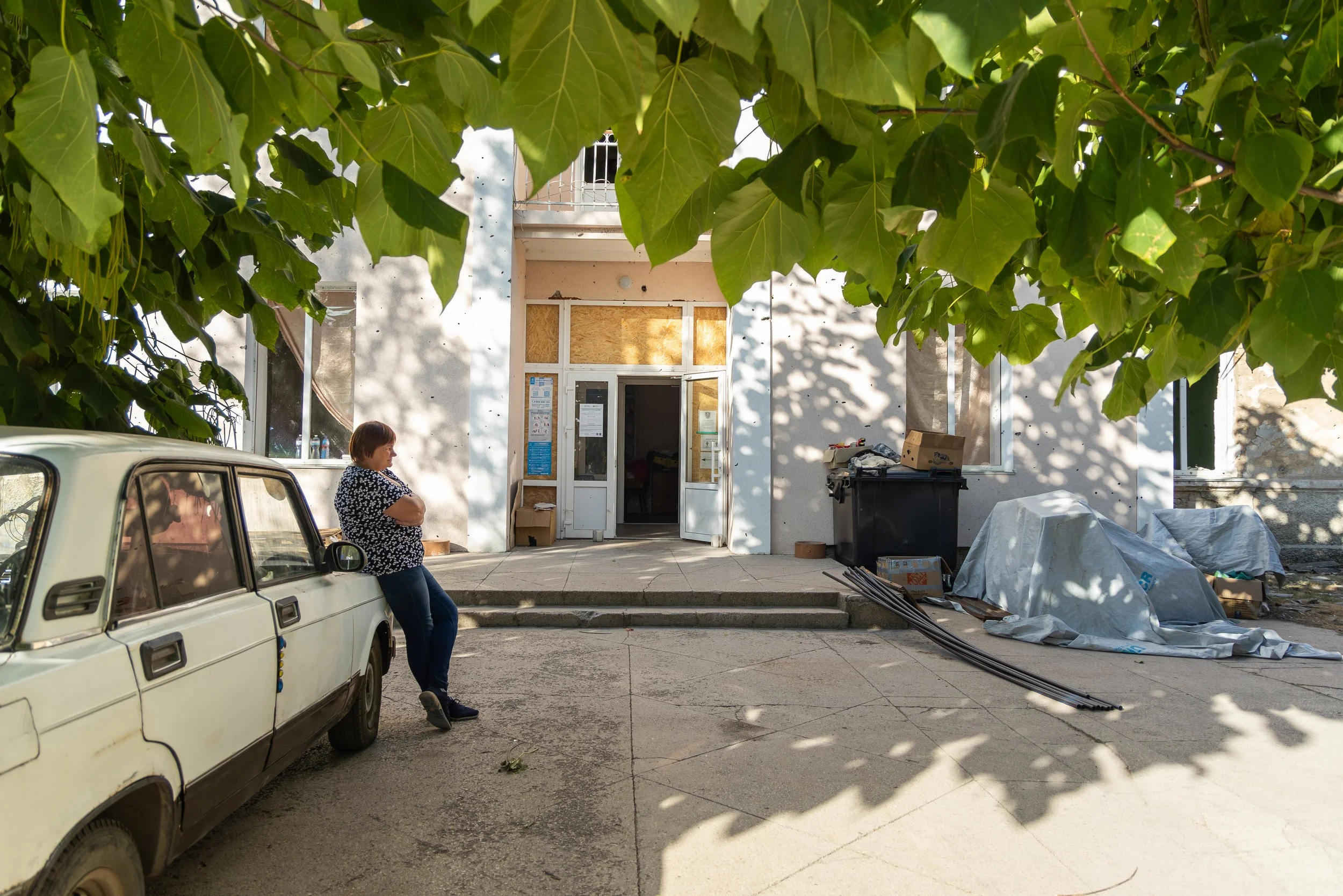 Svitlana, sixty-two years old, greets us outside the glassless doors of the Palace of Culture. Once a hub for the community, the vast, five-story structure has taken on the appearance of a fortress.